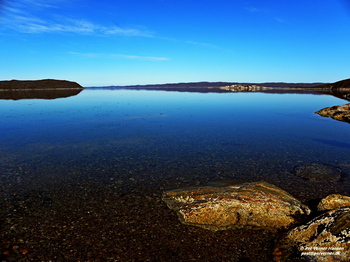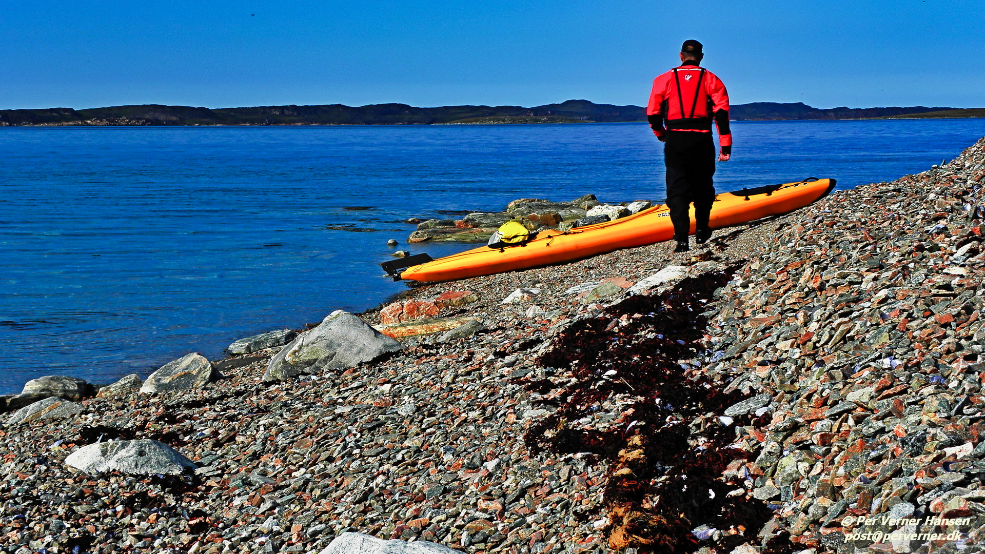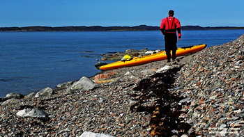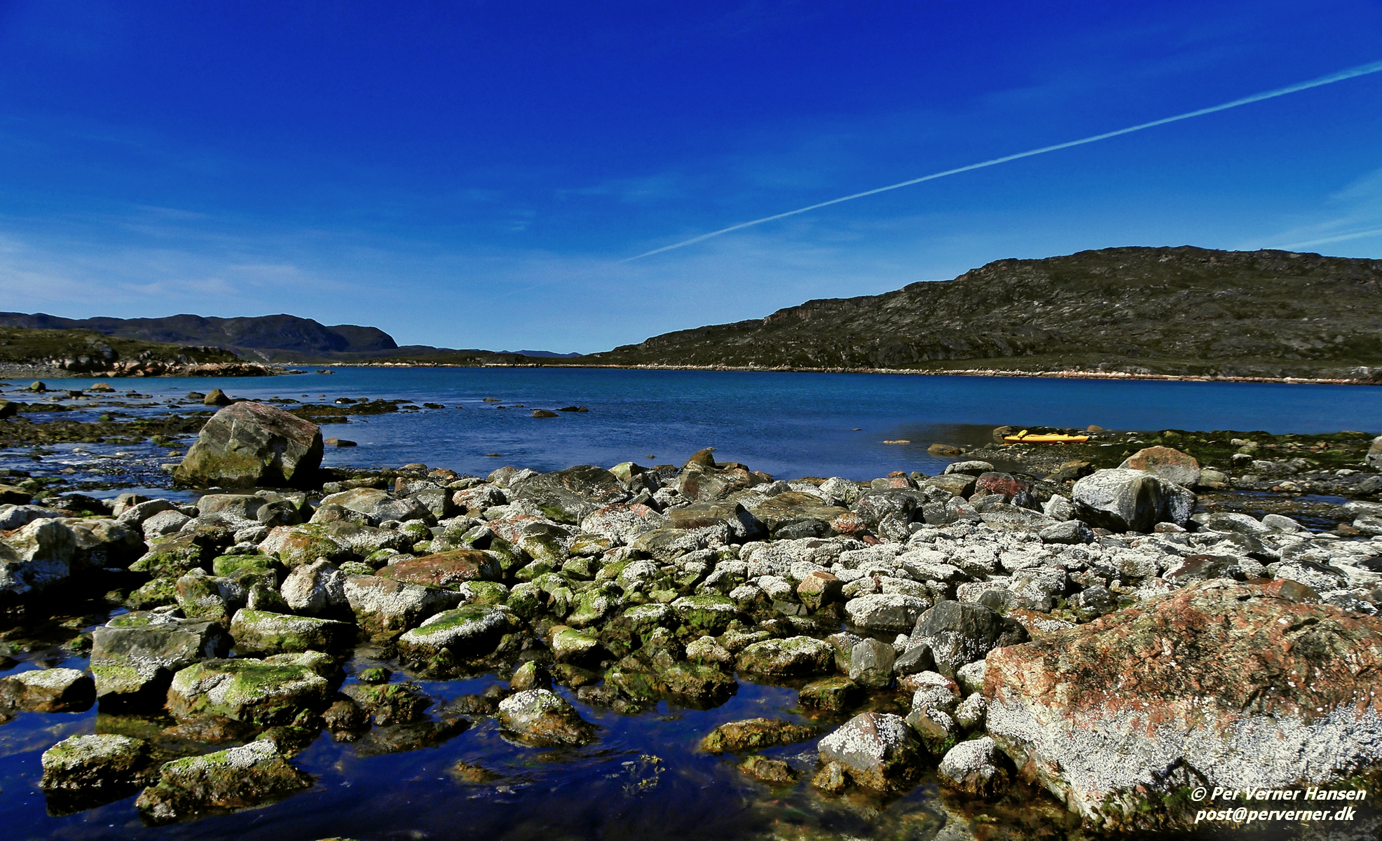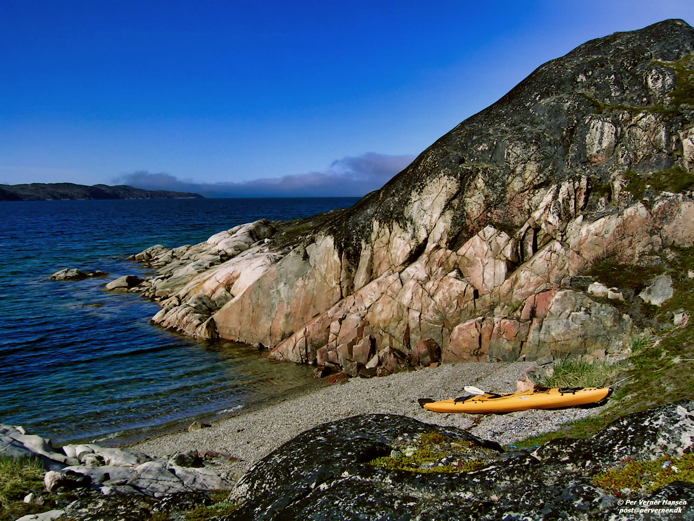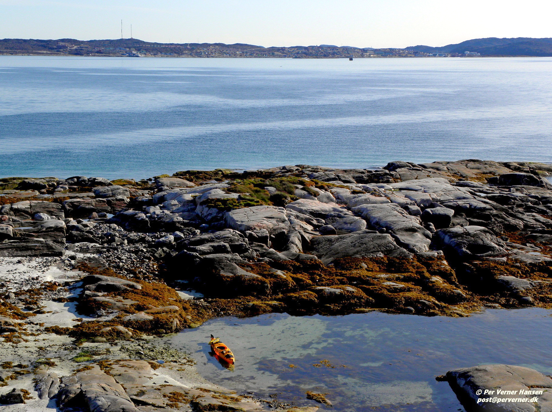 En stenet strand ved lavvande vest for Ikamiut